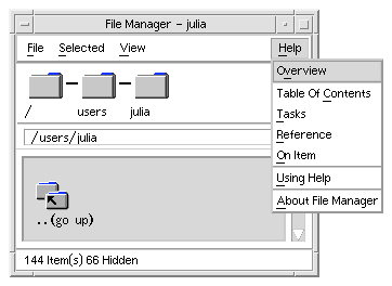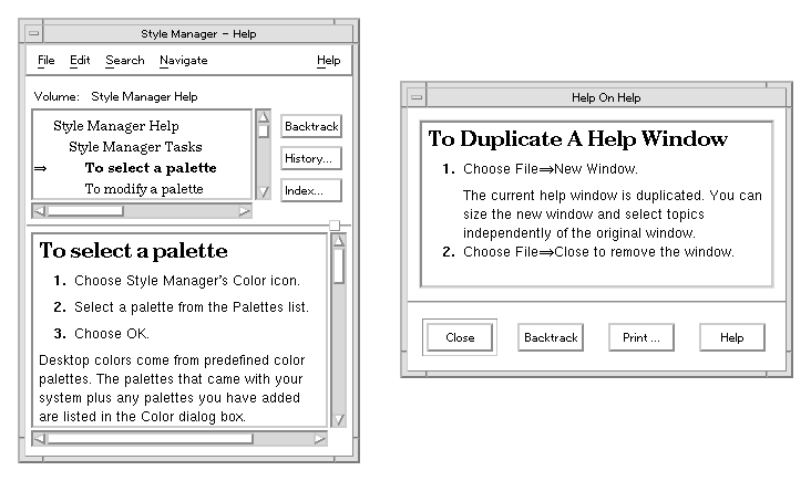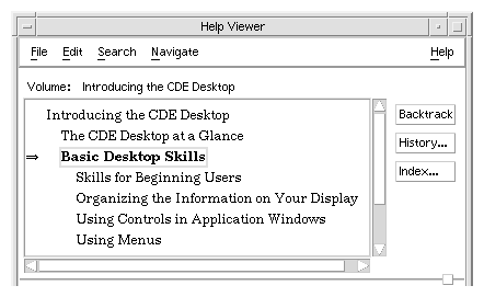 This section is an overview of the graphical interface provided by the Help System. For a detailed description of Help features and capabilities, refer to the CDE User's Guide; or, to view the corresponding online help, you can open the desktop Front Panel Help Viewer (see "To Display the Browser Volume"). Then choose Common Desktop Environment and Desktop Help System.
