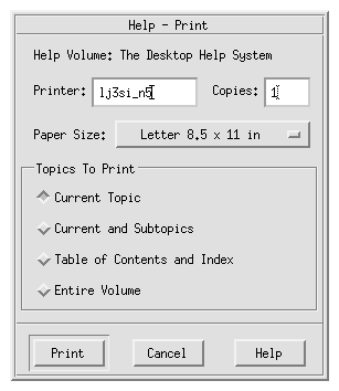 The user can print an individual help topic, a table of contents and index, or the entire help volume. Printed output is text-only. Printing options, such as paper size, number of copies, and destination printer, can also be set in the Print dialog box.
