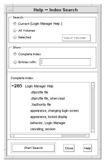 A help volume has an index of important words and phrases that the user can search to find help topics on a subject. A user can browse or search the index of the current volume, selected volumes, or all help volumes available on the system. Regular expressions such as * (asterisk) and ? (question mark) can be used to search for topics. To view the corresponding help topic, the user selects the index entry.