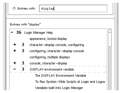 Because the help index can be large even for a single volume, index entries can be expanded or contracted. A prefix notation, either a + (plus) or - (minus) sign, is used to show whether an index entry is expanded or contracted. A minus sign indicates that all of the entries are displayed, whereas a plus sign indicates that the entry can be expanded to show additional index entries.