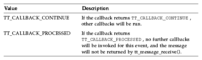 These values are used to specify the action taken by the callback attached to messages or patterns. If no callback returns TT_CALLBACK_PROCESSED, tt_message_receive() will return the message. Table 2-2 describes the possible values.