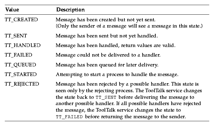 Tt_state values indicate a message's delivery status. Table 2-9 describes the possible values.