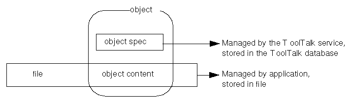 The second part is called the object specification (spec). A spec contains standard properties such as the type of object, the name of the file in which the object contents are located, and the object owner. Applications can also add their own properties to a spec, for example, the location of the object content within a file. Because applications can store additional information in specs, you can identify data in existing files as objects without changing the formats of the files. You can also create objects from pieces of read-only files. Applications create and write specs to the ToolTalk database managed by rpc.ttdbserverd.