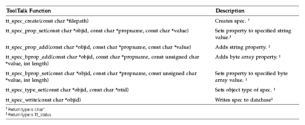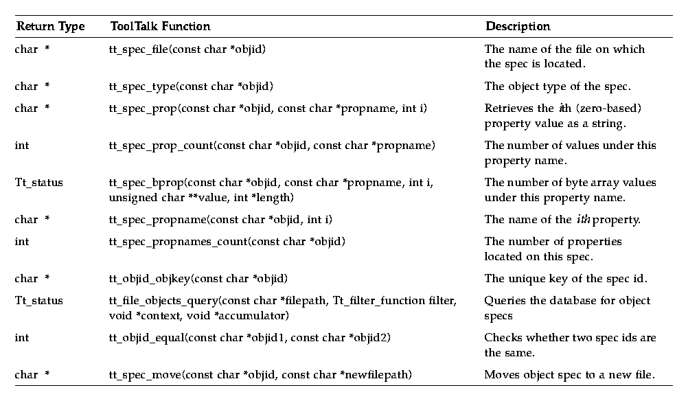 The spec properties are also a convenience for the user. A user may want to associate properties (such as a comment or object name) with the object that they can view later. Your application or another ToolTalk-based tool can search for and display these properties for the user.