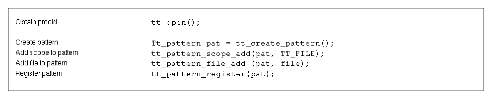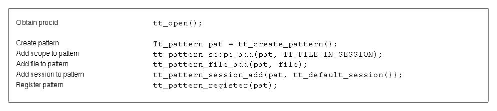 The type TT_FILE_IN_SESSION scopes to the specified file in the specified session only. A pattern with this scope set will only match messages that are scoped to both the file and the session. Code Example 3-5 adds the session and then registers the pattern.