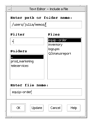 You can insert a text file into your document using a menu command or by dragging a file icon into the Text Editor window (see "To Include a File Using Drag and Drop").