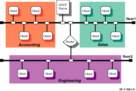 If Figure 7-1 showed a single LAN with no subnetworks (no router), a DHCP administrator might look at this network as one group named acme-net, consisting of three groups (Accounting, Sales, and Engineering) that contain the individual nodes, respectively.