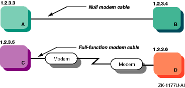 If the two systems are connected through modems and telephone lines, see Section 8.3.1 for modem cable guidelines.