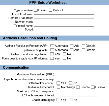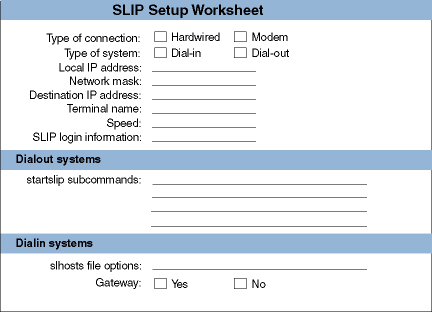 Figure 8-3 shows the SLIP Setup Worksheet, which you can use to record the information that you need to configure SLIP. The following sections explain the information you need to record on this worksheet. If you are viewing this manual on line, you can use the print feature to print the worksheet.
