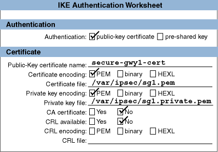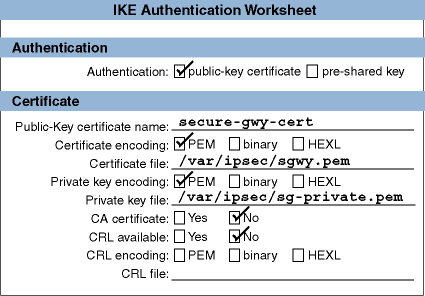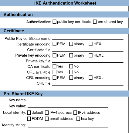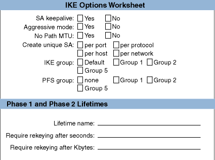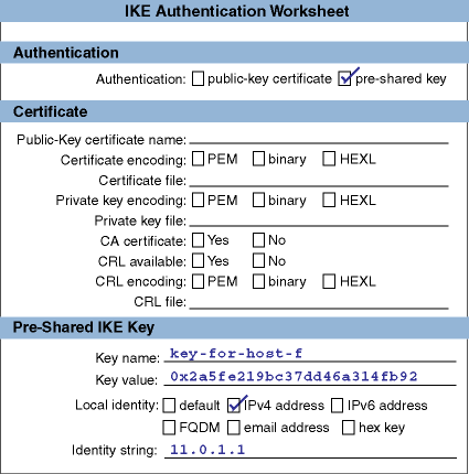 the IKE authentication mode; cipher, hash, and HMAC algorithms; the time the