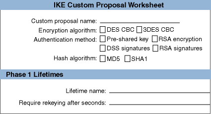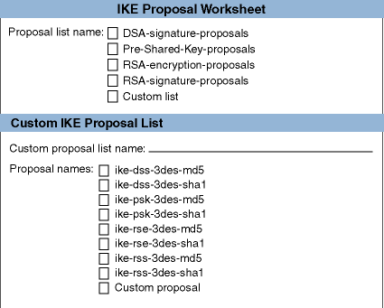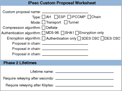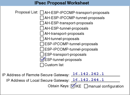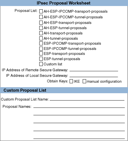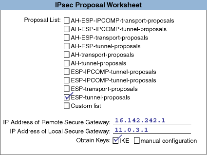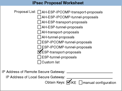 Lists the set of IPsec protocols to be applied, the authentication and encryption algorithms to be used, and associated parameters (the keys). With manual keying, only one proposal (with one protocol and algorithm) is allowed. You use proposals for rules that apply IPsec processing only.