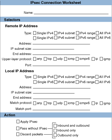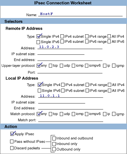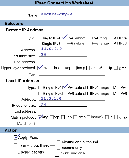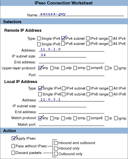 The behavior of IPsec is determined by the secure connections defined on the system. Each secure connection describes a bi-directional connection between two hosts or between two subnets. You define a secure connection by providing a name and a rule for the connection. Each rule contains the following: