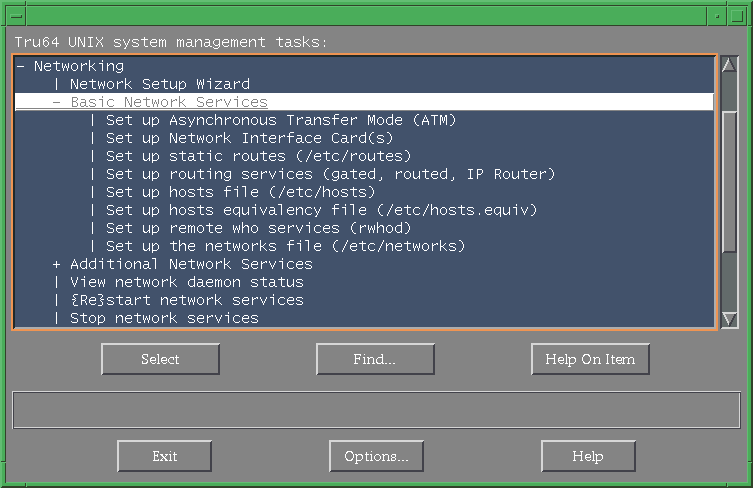 The SysMan Menu also includes a Network Setup Wizard utility that you can use to configure network components on your system. As discussed in Section 2.3, you can invoke the configuration suitlets through the SysMan Menu to configure basic network services on an individual basis, or you can use the Network Setup Wizard, which leads you step-by-step through the setup process for all of the basic network services.