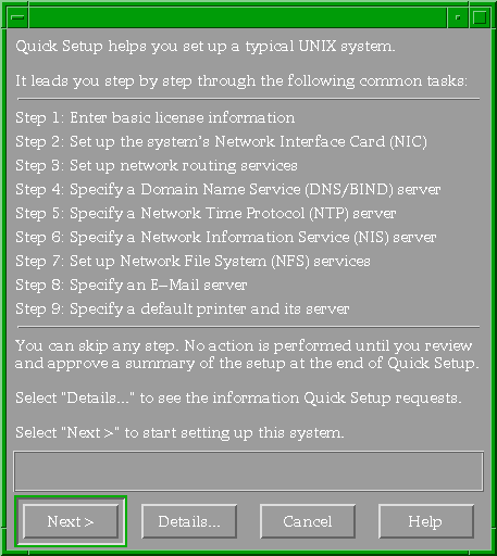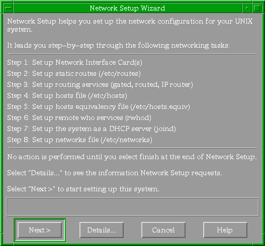 The utility leads you through the displayed configuration steps, many of which prepare your system for operation on a network. Enter the information for each step of the process and select Next to display the subsequent step. You can move back and forth through the steps if you have missed something. No information is saved until you confirm the configuration by selecting Finish in the last step.
