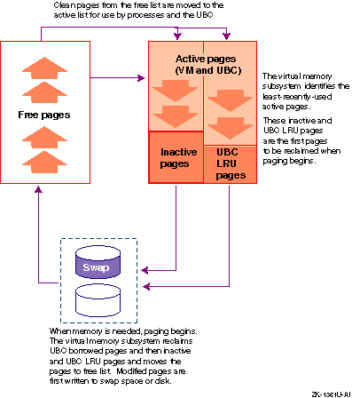 To determine which active pages to reclaim first, the page-stealer daemon identifies the oldest pages on the active list. The oldest pages that are being used by processes are designated as inactive pages. The oldest pages that are being used by the UBC are designated UBC LRU (Unified Buffer Cache least-recently used) pages.