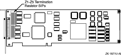 | 1 | Remove the KZPSA-BB internal termination resistors, Z1, Z2, Z3, Z4, and Z5. | Section 10.1.3.4, Figure 10-1, and KZPSA PCI-to-SCSI Storage Adapter Installation and User's Guide |