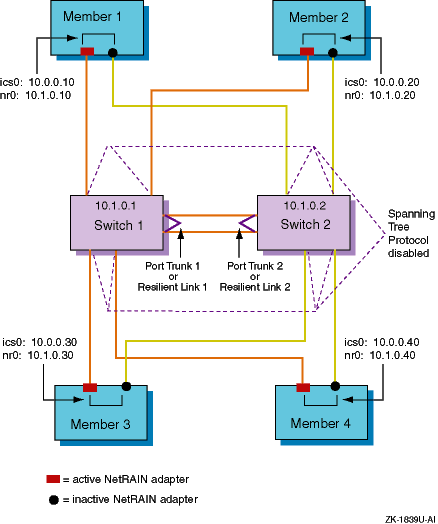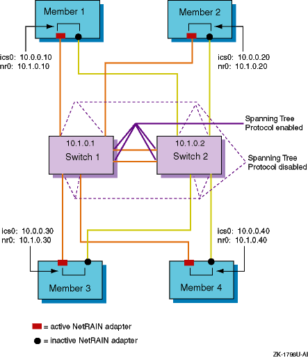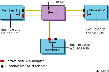 Ethernet adapters on each member are configured as a NetRAIN virtual