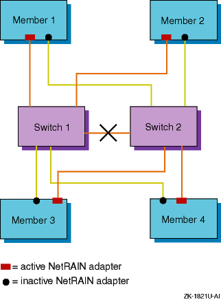 Any member that has multiple Ethernet adapters can configure them as a NetRAIN set to be used as its LAN interconnect interface. Doing so allows those members to remain cluster members even if they lose one internal connection to the LAN interconnect.