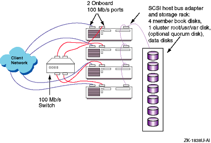 Assuming that each member has one vote, this cluster can survive the failure of a single member or a single break in a member's LAN interconnect connection (for example, the servicing of an Ethernet adapter or a detached cable). From a member's perspective, any member can survive a single break in its LAN interconnect connection. However, the servicing or failure of the switch will make the cluster nonoperational. The switch remains a single point of failure in a cluster of any size, except when it is used in one of the recommended two-member configurations using a quorum disk discussed in Section 6.3.1. For this reason, the cluster in Figure 6-2 is not a recommended configuration.