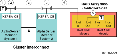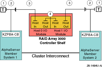 | Install a BN37A-0E 50-centimeter (19.7-inch) VHDCI cable between the RA3000 controller shelf Host 0 I/O module Host Out port and the Host 1 I/O module Host In port. The connection to Host 0 I/O module Host Out port disables the termination on that Host I/O module. | |