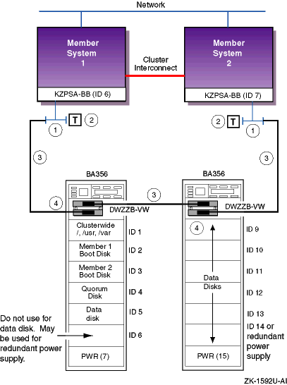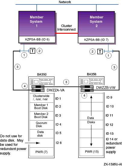 When you use two BA356 storage shelves on a shared bus in a TruCluster configuration, one BA356 must be configured for SCSI IDs 0 through 6 and the other configured for SCSI IDs 8 through 14.