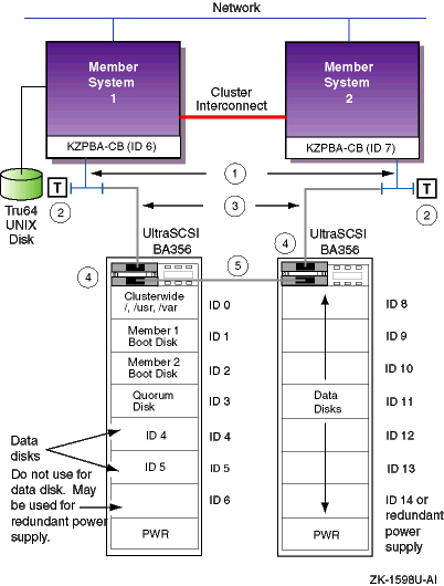 When you use two UltraSCSI BA356 storage shelves on a shared bus in a TruCluster configuration, one storage shelf must be configured for SCSI IDs 0 through 6 and the other configured for SCSI IDs 8 through 14.