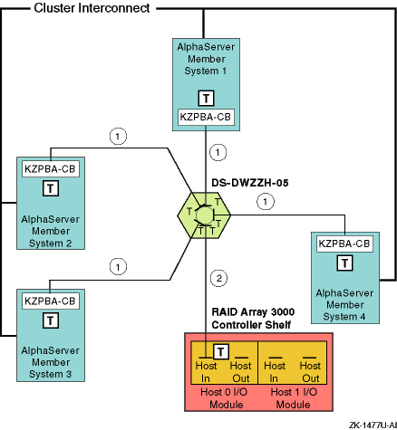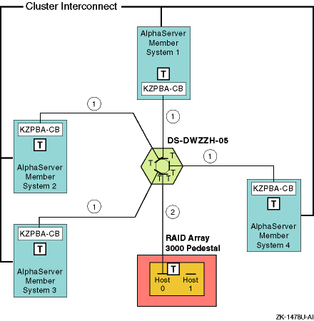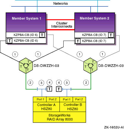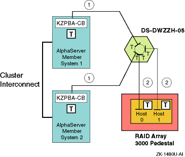 Each host (cluster member system) requires at least two KZPBA host bus adapters.
