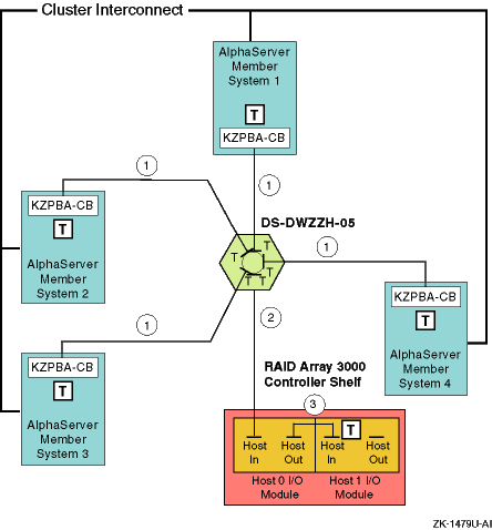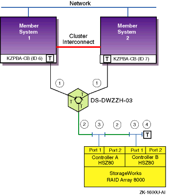To cable a dual-redundant HSZ80 for transparent failover in a TruCluster Server configuration using a DS-DWZZH-03 or DS-DWZZH-05 UltraSCSI hub, see Figure 3-5 and follow these steps: